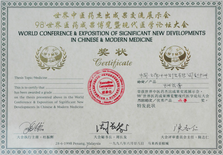 98世界醫藥成果博覽及現代醫學(xué)論壇大會(huì )獎狀
